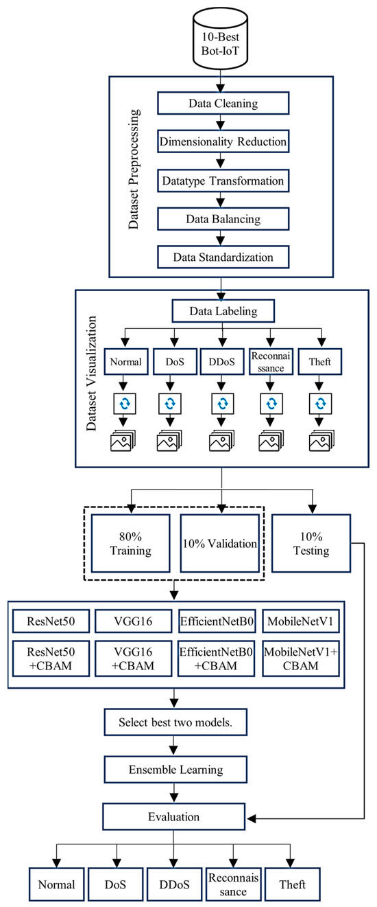 This paper presents an image-based transfer learning IDS. It aims to detect four types of attacks: DoS, DDoS, Reconnaissance, and Theft. The proposed experimental system exploits transfer learning models to obtain accurate results while decreasing the false positive rate. Figure 1 illustrates the proposed IDS model framework used in our experiments. In IoT, training involves developing machine learning models using collected data to recognize patterns and make predictions, often conducted on high-specification devices or data centers before deployment. This approach helps mitigate the challenges of computational cost and facilitates the deployment of the models. Inference is the real-time application of these trained models on IoT devices to analyze new data and generate actionable insights. The system initiates its operation by preprocessing the BoT-IoT dataset. Then, it transforms the compact tabular data into RGB images and splits them into 80% for training, while 20% is equally subdivided for testing and validation processes. The validation subset is used to ensure that no over-fitting occurs. The next stage is the training stage, in which we train our models using the generated training images. The primary goal of using pre-trained models is to reuse the acquired knowledge and weights from previous training; thus, the layers of these models are all frozen. We add trainable top layers to manage the classification of the new data. Moreover, we integrate an attention module into the models. This human-inspired mechanism works by exclusively emphasizing the key input elements, thus improving the prediction accuracy and computational efficiency of intelligent models. In the last stage, we select the two best models to generate the base estimators of an ensemble learning approach that delivers enhanced classification results.