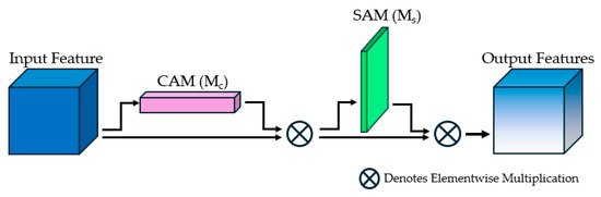 The SAM uses average and maximum pooling as well, but it is associated with a convolution layer instead of the MLP. It generates two 2D maps: ∈ ℝ1×H×W and ∈ ℝ1×H×W. It employs a sigmoid activation function and element-wise multiplication to infer a spatial attention map Ms ∈ ℝC×H×W. The operations of the spatial attention module on an input feature map (F) are expressed as follows [14]: