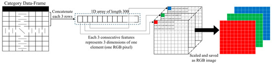 Figure 4. Transformation of the tabular data into RGB images, in which each 3 consecutive feature values represent a color channel of a single pixel.
