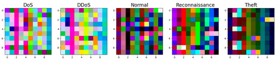 - Data Visualization: CNN models process images better than tabular data [7,24]. This visual representation allows the combining of multifaceted relationships between the features within pixels or regions of the image, allowing the model to capture complex patterns that are challenging to represent in tabular form. Additionally, converting our tabular data into images leverages the power of selected pre-trained image models. Therefore, after preprocessing the dataset, we transformed our tabular data into a set of images and used them as input for the learning-based model. We first assorted the dataset into five categories, which are DoS, DDoS, Reconnaissance, Theft, and Normal. Afterward, we divided each category into blocks of 30 samples, where each sample had 10 features, and all these 30 × 10 feature vectors were concatenated in a 1D vector of length 300. The vector was then reshaped into a 3D array of size 10 × 10 × 3. In this reshaping process, we grouped 3 consecutive feature values into one pixel to represent the three-color channels of the image. Afterward, we scaled the data from 0 to 255, which is the range of an 8-bit image pixel. The process of transforming a category subset is depicted in Figure 4. The total number of created images is 14,715 images. Figure 5 shows the transformed images.