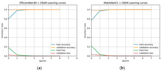 The learning curves of the two best models: (a) the training and the validation curves of the EfficientNetB0 with the CBAM; (b) the training and the validation curves of MobileNetV1 with the CBAM.