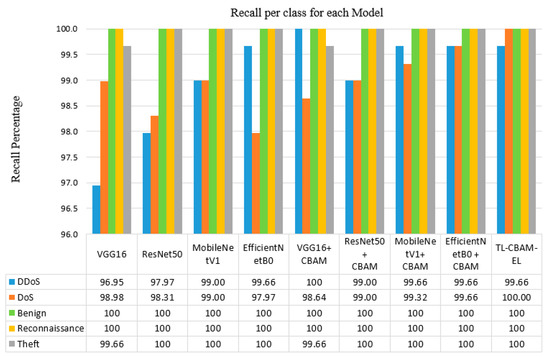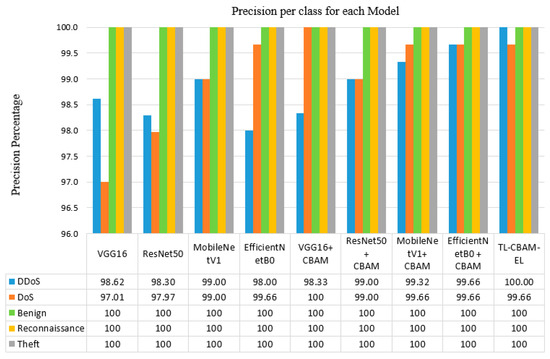 As shown in Figure 7, MobileNetV1 and EfficientNetB0 models demonstrate exceptional performance, achieving above 98% precision for “DDoS” and “DoS” attacks and perfect precision for “Normal”, “Reconnaissance”, and “Theft” classes. Moreover, integrating the CBAM enhances the precision of all models, with the TL-CBAM-EL model standing out by recording near-perfect scores across all classes. The high precision indicates that the models are effective at correctly identifying attacks with low FPR.