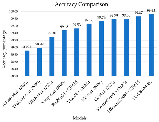 To assess the efficiency of our final model, we compared it to different models previously overviewed in Section 2. In our comparison, we consider diverse approaches to ensure the novelty and competitiveness of our approach. For a valid comparison, all selected models use the BoT-IoT dataset. As shown in Figure 10, incorporating the CBAM with the MobileNetV1 and EfficientNetB0 exhibits superior performance. The TL-CBAM-EL model surpasses all other models concerning accuracy. This strongly supports the conclusion that our TL-CBAM-EL model is an effective model for IoT intrusion detection and demonstrates its capability to accurately identify intrusions with high precision compared to its predecessors.