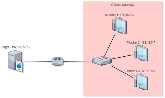 In this research, the first step that we conducted was collecting relevant data. The data for this study were obtained from live penetration testing, where a series of simulated attacks were performed on a monitored network. The data collection was conducted in a controlled environment to ensure validity and realistic representation of real-world attack scenarios, including various types of DDoS attacks. The data collected included attributes such as time, source, destination, protocol, length, clusters, and anomalies. These data include information about normal and suspicious network traffic. The size of the data has been written as 1,048,575 records. This data collection is important as it provides a basis for model training and evaluation. Data were taken from sources that have network traffic records, which reflected the real conditions of the observed network. When data were collected, the host with the IP address 172.16.0.6–172.16.0.8 became the DDoS attacker, while the host with the IP address 192.168.50.12 was the target of the attack. This host with an IP address received massive and abnormal traffic from IP addresses 172.16.0.6–172.16.0.8. The data used were 1,048,575 records collected for DDoS attack detection analysis. These data include time, source, destination, protocol, and length of traffic. The data were then processed using SMOTE and analyzed using the LSTM algorithm. The simplified network topology is represented in Figure 2.