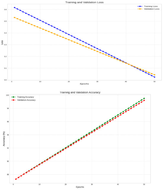 The or F1 score is important because it offers the next information about the network performance. It considers both false positives and negatives. The F1 score is beneficial, especially in cases where the class label distribution is unbalanced. The was computed using Equation (11), which demonstrates the consistency of and :