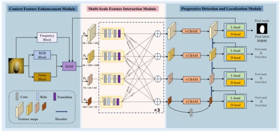 Our goal is to extract artifacts hidden in forged images and leverage a hierarchical and progressive network to enhance the model’s ability to detect and locate forged images. In this section, we will introduce HPUNet, as shown in Figure 2, which consists of three modules: the contextual feature enhancement module (Section 3.1), the multi-scale feature interaction module (Section 3.2), and the progressive detection and localization module (Section 3.3). In Section 3.4, the loss function used in the experiments will be introduced.