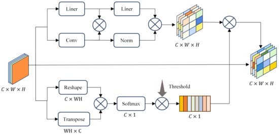 where represents the channel weight, threshold represents the threshold value, and the threshold is obtained through the feedback of detection and positioning results. and are hyperparameters that control the variation in the channel weight. Through this weight transformation, the model focuses more attention on the strongly task-related features.