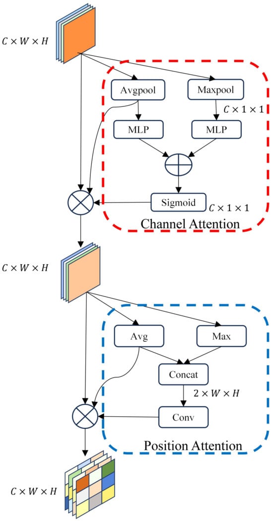 In addition, to preserve the semantic features of the main subject and eliminate irrelevant features, while considering computational resources and better adaptability, we propose a soft-threshold dual-attention module within the skip connection structure of HPUNet to process the features, as shown in Figure 5. To ensure flexibility between each branch, the threshold selection remains relatively independent between different branches. First, we calculate the absolute value of the intermediate feature map. Then, we multiply the channel feature’s average pooling and the spatial feature’s average calculation along the channel dimension by the channel attention weight coefficient and the spatial attention weight coefficient, respectively, to obtain the target thresholds. Finally, the feature map is filtered using these two thresholds. The mathematical description of this process is as follows: