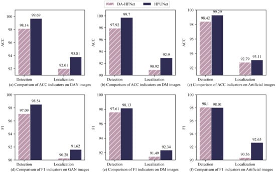 Firstly, HPUNet is subjected to comparative experiments with the baseline methods on the task of fake image detection, and the results of the different methods on fake image detection are reported in Table 2. Specifically, from the first to the third row in Table 2, it can be observed that the detection results using pre-trained detectors on the AITfake dataset are generally poor, which is directly related to the feature expression ability learned by the detectors from the traditional fake images. Among them, Trufor is an excellent fake image detector, while PSCC-Net and HIFI-IFDL are representative methods based on hierarchical networks. After unifying the training datasets, from the fourth row to the last row, it can be observed that, compared with the baseline methods, HPUNet exhibits the best ACC and F1 scores on both GAN-based and DM-based fake images. On the manually manipulated images, the ACC score is 0.87% higher than the second-best, and the F1 score is also highly competitive. Overall, our method outperforms the second-best in both the ACC and F1 scores, with average improvements of 1.4% and 0.43%, respectively. We believe this is because HPUNet is able to learn image features with stronger representation capabilities. We present a comparison diagram in Figure 6, which shows the dimensionality reduction regarding the validation set data using the t-SNE approach for different methods. It can be observed that HPUNet is better able to distinguish different categories of fake images compared to the other methods. Meanwhile, in Figure 7, we compare HPUNet with our previous work, DA-HFNet, and it can be seen that HPUNet has improved in both ACC and F1 metrics, demonstrating that our improvement measures are effective in enhancing the detection performance of the model.