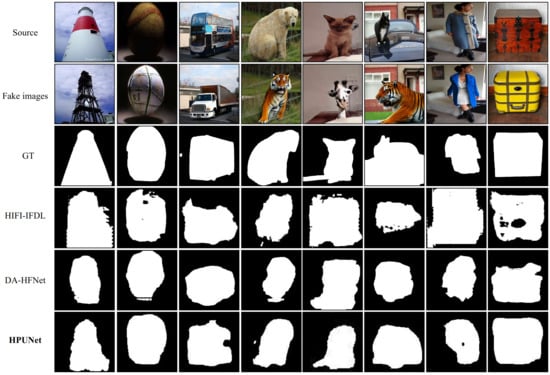 To validate the effectiveness of HPUNet, we conducted cross-dataset validation experiments. The training dataset was composed of the AITfake dataset, while the validation datasets were derived from four public datasets: CoCoGLIDE [], HIFI-IFDL [], GenImage, and Casia. We report the experimental results of the cross-dataset validation in Table 4. As can be seen from Table 4, in the cross-dataset validation tasks, HPUNet performed at the first or second level on all the datasets, still demonstrating a clear advantage over the baseline methods.