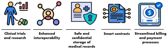 - Stagnaro, C. White Paper: Innovative Blockchain Uses in Health Care; Freed Associate. 2017. Available online: https://s3.amazonaws.com/arena-attachments/1649918/a272c30523a39678dadcddc272d53a24.pdf?1516914525 (accessed on 5 May 2024).