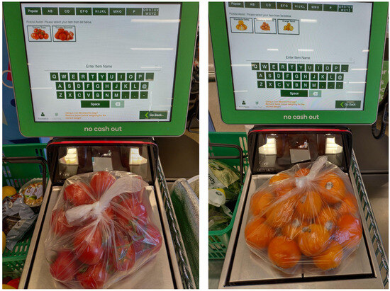 Uncertainty in detecting fresh produce items at a supermarket self-checkout equipped with a machine vision system. (Left): The system has analysed a transparent plastic bag containing truss tomatoes and identified two possible categories, namely, truss tomato and gourmet tomato, leaving the final selection to the customer. (Right): In another test with a bag of Amorette mandarins, the system has suggested three potential options: Delite mandarin, Amorette mandarin, and Navel orange. Similar results are observed with other visually ambiguous items.