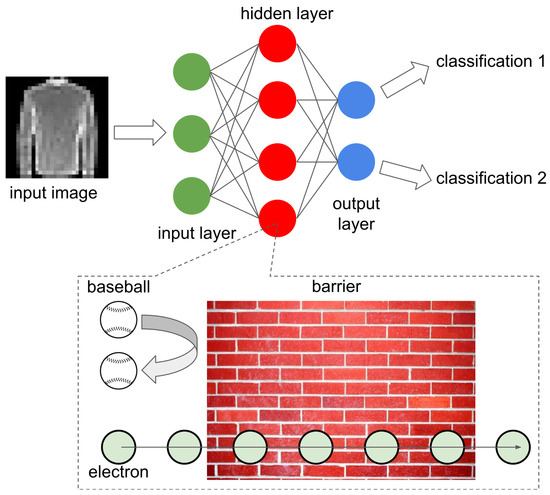 Recently, a novel neuromorphic QNN architecture was introduced in [12] utilising the physical effect of quantum tunnelling (QT), which describes the transmission of particles through a high potential barrier [51,52]. In classical mechanics, a baseball with energy , where is the height of the barrier, cannot penetrate the barrier (see Figure 2, where the barrier is depicted as a brick wall). However, an electron, which is a quantum particle behaving as a matter wave, has a non-zero probability of penetrating the barrier and continuing its motion on the other side. Similarly, for , the electron may still be reflected from the barrier with a non-zero probability.