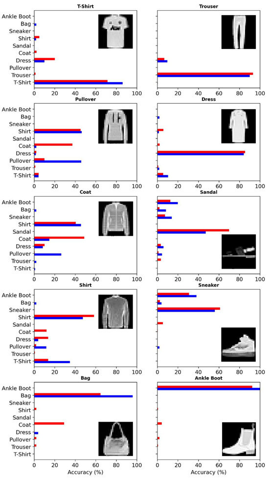 Figure 3 provides an alternative to the commonly used confusion matrix [77]. We established that its composition offers more detailed information, which proves particularly valuable in applying the statistical tools outlined earlier in the text. Specifically, the title of each panel in Figure 3 indicates the actual type of fashion item that each model was tasked to recognise and classify, while the bar height represents the accuracy with which each model classifies the item. For example, when presented with 50 images of the ‘Trouser’ category, the QT-NN and classical models correctly classify the items as ‘Trouser’ with respective accuracies of 93.2% and 90%. Both models also suggest that these items could be ‘Dress’, with respective accuracies of 6.8% and 10%. As another example, while the classical model presented with the test images of the ‘Ankle Boot’ category correctly identifies this item with accuracy of 100%, the QT-NN model identifies it with 92.4% accuracy, also suggesting with respective lower accuracies that the items could be ‘Coat’, ‘Pullover’, ‘Shirt’, and ‘Trouser’.
