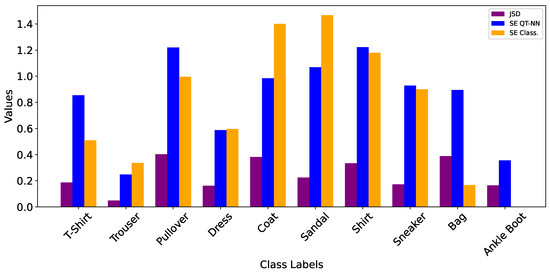 Analysis of the JSD and SE figures-of-merit (Figure 4) provides insights into the prediction similarities and uncertainty levels between the QT-NN and the classical model. A lower JSD score closer to 0 indicates high alignment between the probability distributions of the models, as seen in the ‘Trouser’ category (JSD = 0.049), where the two models produce nearly identical predictions. Conversely, a higher JSD score like that of the ‘Pullover’ category (JSD = 0.403) signals substantial divergence, implying the models interpret this category differently. SE values supplement this by highlighting uncertainty levels in predictions, where a higher entropy indicates more ambiguity. Notably, the QT-NN model shows greater uncertainty for ‘T-Shirt’ compared with the classical model (SE = 0.8542 for the QT-NN compared with SE = 0.5093 for the classical model). Additionally, categories such as ‘Coat’ and ‘Sandal’ yield higher SE values for the classical model, suggesting that the predictions of the classical model are less confident. However, ‘Bag’ has minimal entropy for the classical model (SE = 0.1672), implying high certainty, whereas the QT-NN shows moderate uncertainty (SE = 0.8943).