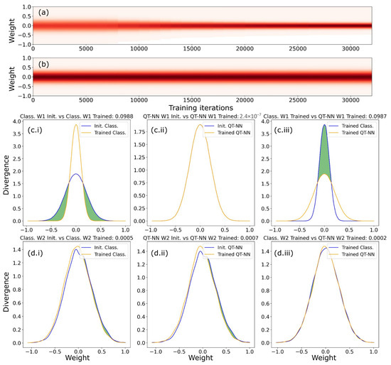 In Figure 5a,b, the weight distributions exhibit Gaussian profiles centered around zero, which is consistent with the central limit theorem [83]. At the start of training, the weight distributions for both the QT-NN and classical models are identical. However, focusing on the weights in Figure 5a, training causes the distribution profile of the classical model to narrow, indicating a reduction in the diversity of weight values. This trend is further illustrated in Figure 5c.i, which shows the JSD analysis results for the initial and trained weights of the classical model.