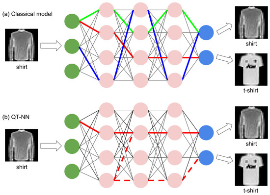 Schematic illustration of the training process of (a) the classical model and (b) the QT-NN model, inspired by the discussion in [80]. The coloured lines illustrate the possible pathways of neural connection formation. Note that the additional hidden layers of neurons are included purely for the sake of illustrating more advanced neural connections; also, note that the neural connections of the QT-NN model, depicted by the solid and dashed lines in panel (b), are equally valid from the perspective of the algorithm and possess a probabilistic quantum nature.