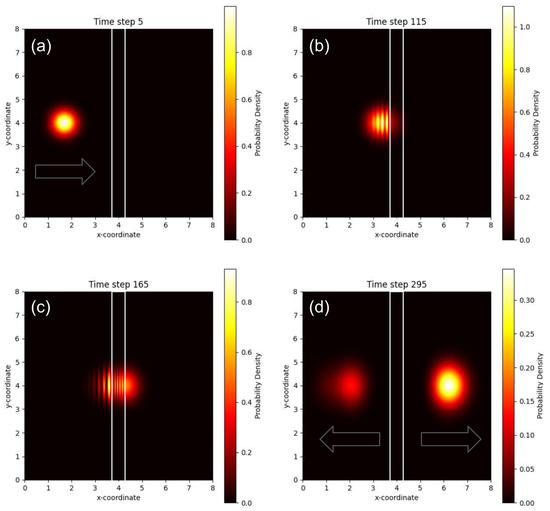 From the physical perspective, the process of tunnelling and probabilistic action of weight coefficients can be illustrated using a two-dimensional mathematical model in which the weights are represented as a Gaussian shaped energy packet, which in turn represents a single electron that moves towards a potential barrier (Figure 7). The motion of the energy packet, the direction of which is indicated by the arrows in Figure 7, and its interaction with the barrier, indicated by the white rectangle in Figure 7), are governed by the Schrödinger equation, which is solved using a Crank–Nicolson method [92]; the same numerical experimental setup has been demonstrated to accurately model problems related to human cognition [93].