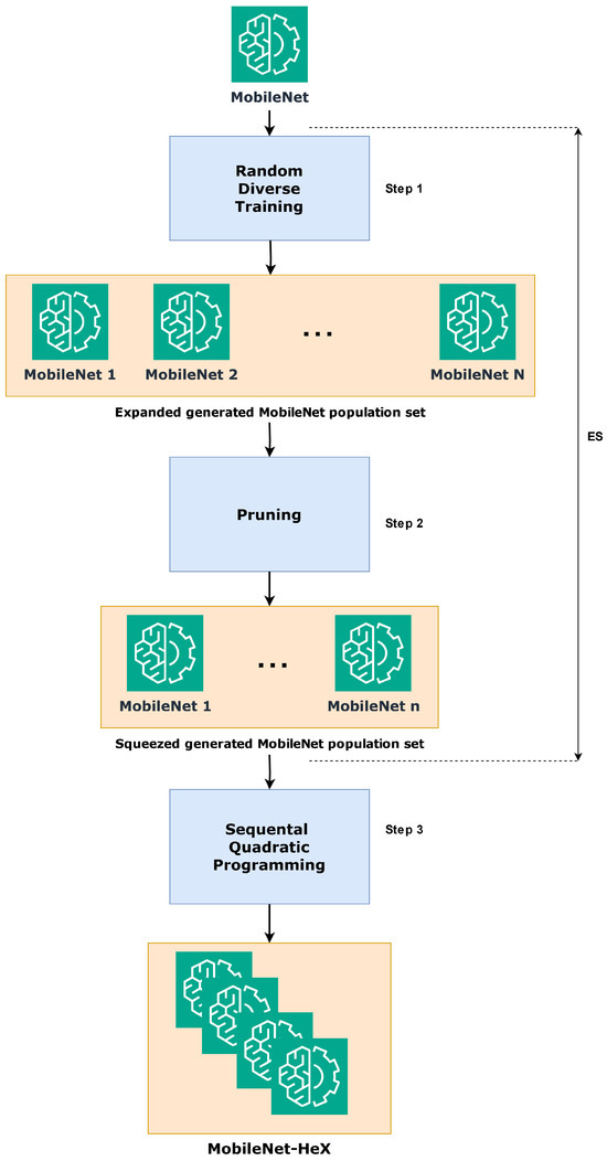 Figure 1 illustrates the entire process of constructing the MobileNet-HeX model. The process begins with the two-step ES phase, which encompasses step 1 and step 2. In step 1, the MobileNet population is expanded by training a diverse set of models under various random conditions and setups. In step 2, a squeezing mechanism is applied, where models are selectively pruned to form a refined set of MobileNets base learners. These learners are chosen based on the proposed heterogeneity-driven approach, ensuring that the resulting set represents a diverse and heterogeneous mix of well-performing models. Following the ES phase, in step 3, sequential quadratic programming (SQP) is employed to combine the squeezed set of MobileNets, generating the final MobileNet-HeX ensemble model.
