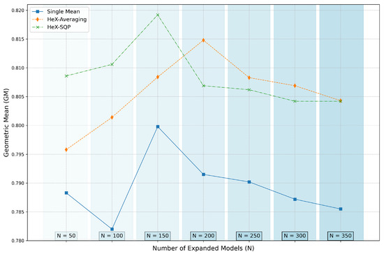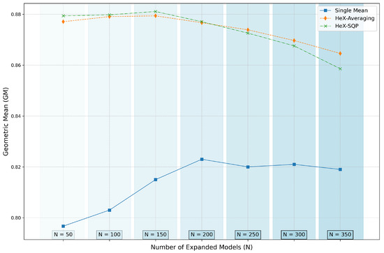 The ablation study further validates the robustness of the Heterogeneous eXperts method. By examining different ensemble configurations, including HeX-Averaging and HeX-SQP, the results reveal several important findings. For ensembles constructed with a moderate number of expanded models, such as to , the HeX-SQP method consistently delivers superior performance. This range strikes a balance between diversity and overfitting, allowing the selected models to effectively complement one another. However, as the number of expanded models exceeds , the risk of validation overfitting becomes evident. This phenomenon arises when the expanded pool includes models that achieve high validation scores by chance, introducing noise into the ensemble.