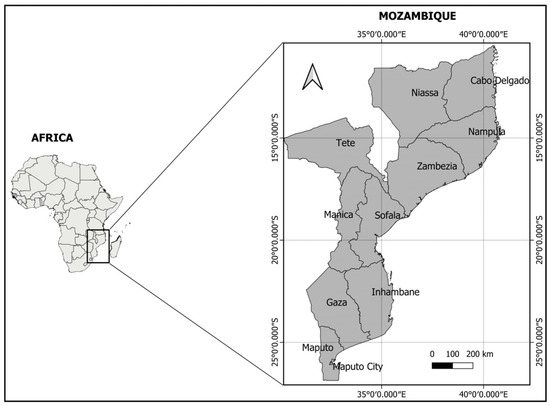 Mozambique is located on the southeastern coast of Africa and has a surface area of 801,590 square kilometers. Mozambique borders Zimbabwe, Tanzania, Zambia, Malawi, Eswatini, and South Africa. Its 2500 km long coastline along the Indian Ocean, facing the east of Madagascar. The country is divided into ten provinces and a provincial capital city. It is estimated to have a population of 33 million, of which 62% reside within rural regions. The country is composed of 154 districts, 444 administrative posts, and 1164 localities [37]. However, the data available and used in this study consist of 411 administrative posts. Figure 1 presents the study area.
