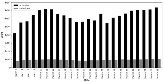 In this research, 24 days (6 March 2019–29 March 2019) worth of CDRs were used. These data were originally provided by the INCM for the purposes of study [31] and have been reused in the present study, thereby avoiding the need for a formal request for a new dataset from the communications regulator. Figure 2 shows the distribution of daily activities and the number of active subscribers.
