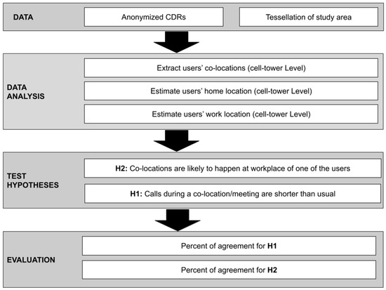 Face-to-face interaction estimation using mobile phone anonymized CDRs consists of multiple steps, some of which were carried out using established techniques from prior research [31]. The proposed method consists of six main steps, namely (1) Voronoi tessellation of the study area, (2) estimation of co-locations, (3) estimation of mobile phone users’ home location and work location, (4) testing the hypotheses, (5) quantify the per cent of agreement of the proposed hypotheses, and (6) assignment of the results at Post-Administrative Units. Figure 3 summarizes the method used in this research.