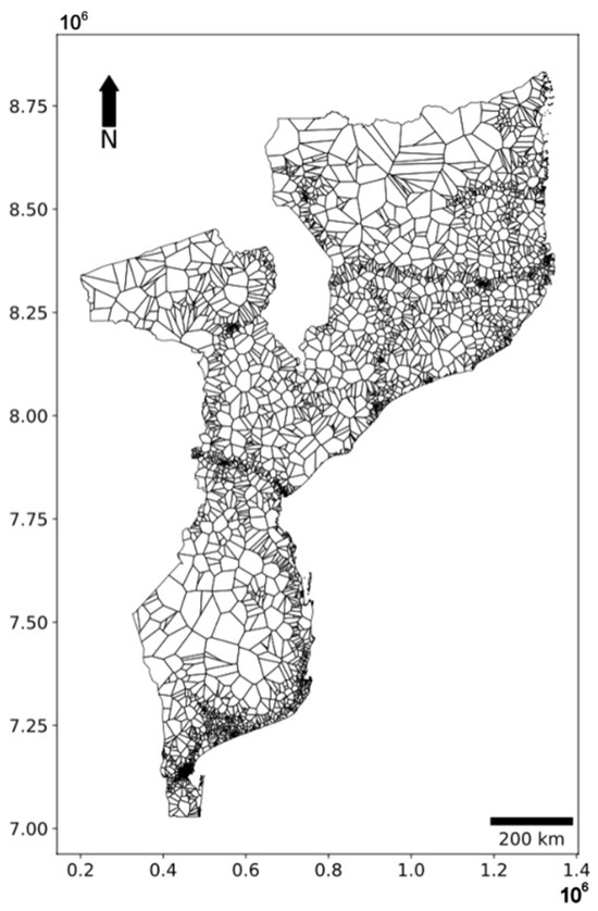 The study area comprises 4918 cell towers, spatially distributed based on population density, meaning that densely populated areas have a higher concentration of cell towers. Hence, each cell tower’s coverage area decreased in highly populated areas. Using cell tower locations as centroids, Voronoi polygons of the study area were constructed using the principles presented by Boots et al. [38], as shown in Figure 4.