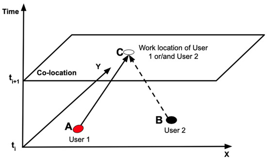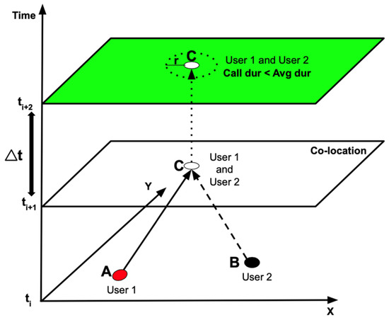 In Figure 6, at time ti, User 1 and User 2 are at locations A and B, respectively. At time ti+1, the users co-located at location C and spent Δt, and one of the users received a call while at the exact location. The duration of this call was compared to the average call duration of that user for the entire study period. r is a scalar used to reduce the effect of false displacement, which happens when a user makes or receives a call while their nearest cell tower is fully loaded. The mobile phone operator assigns their mobile activity to another cell tower.