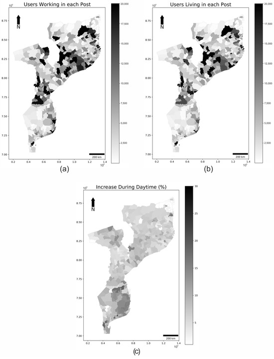 Total number of users (a) working and (b) living, and (c) the percent of increase during daytime in each PAU (source: created by the authors).