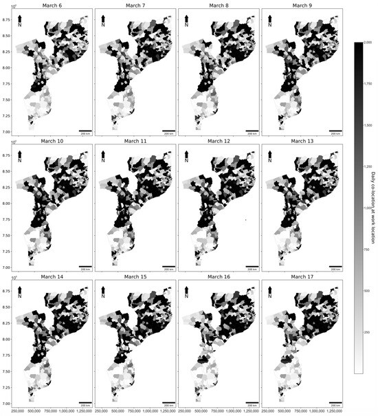 Table 2 suggests that 6 March and 29 March registered the most minor and highest co-location events during the study period, respectively. The number of co-location events increased initially and stabilized on 10 March. From 14 March, the number of co-location events reduced and increased until 23 March, stabilizing until the end of the study period. This last reduction in co-location events can be associated with cyclone Idai, which hit Beira city (in Central Mozambique) on 14 March 2019, causing massive flooding, leaving entire communities submerged under 10 m of water, and damaged infrastructure and roads, with about 3 million people were affected [31]. Along its path, cyclone Idai destroyed many infrastructures, including electricity and telecommunications towers. Therefore, four-to-five days after the cyclone hit Beira city (in the central part of Mozambique), many cell towers were out of order and failed to register mobile phone activities.