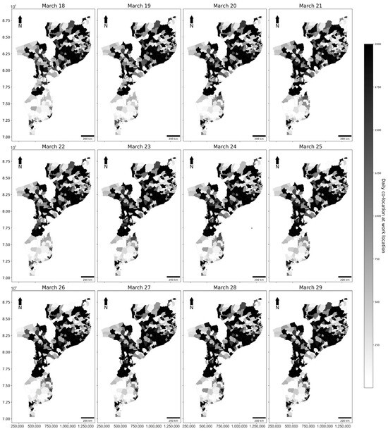 Figure 9 suggests that the affected regions’ cell towers failed to register the activities for more than 4 days. However, from 22 March, there was a clear tendency for recovery of the cell tower; hence, the number of co-locations increased significantly up to the last day (29 March), when over 90% of the cell towers were operational.