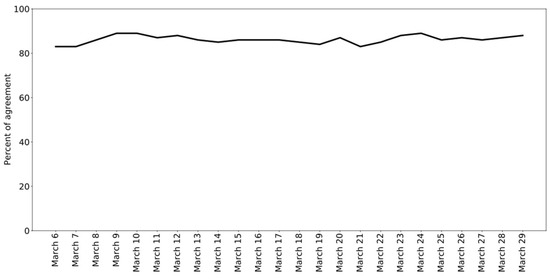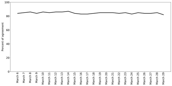 The daily percentage of agreement was computed to evaluate the first hypothesis. Figure 10 shows the daily percentage of agreement.
