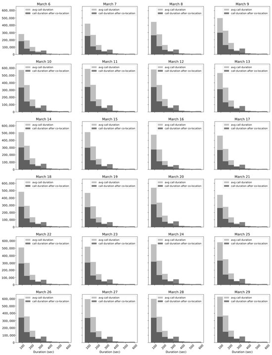 From Figure 11, it is clear that overall, there are similar distributions between the average duration of calls and the duration of calls right after co-location. It is also clear that the distribution of the average duration of calls is greater than the distribution of the duration of calls right after co-location for the whole study period for calls with a duration less than or equal to 300 s (5 min). However, there is an opposite trend for calls with a duration greater than 5 min, i.e., the average call duration distribution is lesser than the call duration distribution right after co-location.