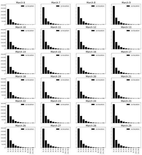 To measure the dynamics of face-to-face meetings in the study area, the co-location events were aggregated by subscription, and the results are shown in Figure 14.