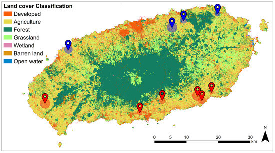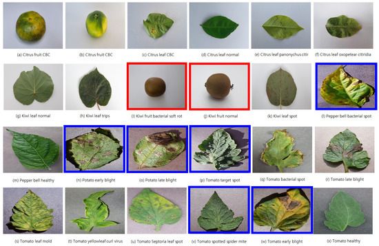 In this research, we constructed a dataset for experimental use by integrating a public dataset with private data collected from farmlands. The public dataset PlantVillage consists of crops such as potatoes, bell peppers, and tomatoes. This dataset comprises over 40,000 images of leaves. We also collected a new dataset from citrus and kiwi crops. The images were obtained from farms located in Jeju City [25], South Korea (∼ E, ∼ N). Figure 1 displays the geographic map of the study area, indicating the locations of the citrus and kiwi farms with red and blue pinpoints, respectively. All the collected images were in-field images captured directly by agricultural experts on the farms. To maintain consistent image quality, the experts adjusted the shooting height, angle, and lighting distance according to the disease types of each crop and carefully avoided shadows and light reflections during the capturing process.