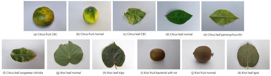 - We collected private data on citrus and kiwi varieties and enhanced the validity of our experimental results by including the PlantVillage dataset, a public dataset. The constructed dataset comprises a total of 60,165 images, representing a large-scale dataset; however, the classes are imbalanced. We addressed the data bias problem by employing stratified cross-validation for verification.