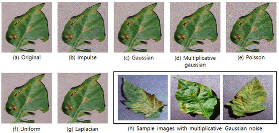 The training dataset for the ‘bell pepper bacteria spot’ class consisted of 797 images, whereas the ‘tomato leaf mold’ class consisted of 752 images. As a result, additional images were generated and incorporated into the dataset. In this study, we employed a data augmentation strategy by generating new images through the application of realistic noise to the existing dataset. Common types of noise that occur in real-world scenarios include impulse noise [26], Gaussian noise [27], multiplicative Gaussian noise [28], Poisson noise [29], uniform noise [30], and Laplacian noise [31]. Figure 3 presents representative samples of the training images with six different types of applied noise.