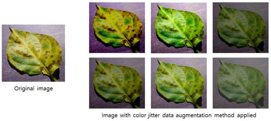 Similar to other techniques, color inversion and grayscale transformations are intended to highlight the patterns of diseases found in the image. However, they may not be suitable for cases in which the contrast levels of colors, as indicated by the red box in Figure 4, do not display substantial differences. In contrast, the color jitter augmentation method allows users to adjust the brightness, contrast, saturation, and hue of the image, thereby enabling controlled color distortions within a range that avoids blurring disease-related objects. Particularly, brightness and contrast adjustments can mimic the different environmental conditions found in actual agricultural settings. For example, reducing the brightness can simulate images captured in darker environments, whereas increasing the brightness can simulate images captured in well-lit areas during daylight hours. Therefore, this study conducted experiments by gradually increasing the intensity from 0% to 50%. As a result, randomly applying brightness, contrast, and saturation within a range of up to 35% resulted in optimal performance. Additionally, to preserve the original colors of the images and avoid abrupt color transitions that could lead to the loss of disease features, hue intensity was modified within a range of up to 10%. Sample images with these intensity adjustments are shown in Figure 5.