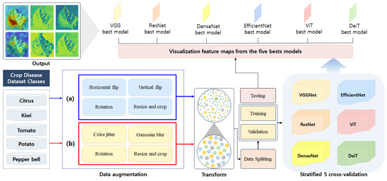The crop disease classification model utilized six pretrained deep learning models: VGGNet, ResNet, DenseNet, EfficientNet, ViT, and DeiT. The input sizes of the models varied depending on their size and type. To examine the performance differences of the combined data augmentation methods in the same environment, the input size for all six models was standardized to . The images, resized to pixels as described in Section 5, underwent data preprocessing based on strategies (a) and (b). The test dataset, which was used for model validation, underwent only resizing, tensor conversion, and normalization without data augmentation for image transformation.