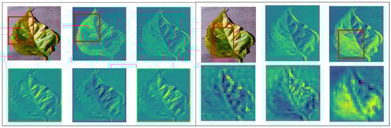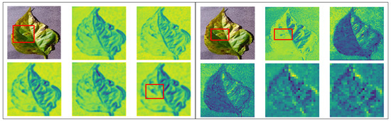 To better understand the six models and crop diseases, we loaded the weights of the model that achieved the highest F1 score according to Table 5 and visualized the feature maps. The feature maps represent the process of extracting patterns as the models pass through the layers and capture the characteristics of crop diseases. By examining the feature maps, we saw how the models perceived the features of agricultural pests and diseases. The red bounding box highlights regions within the feature map where the disease object is prominently represented, providing an analytical visualization of its salient characteristics.