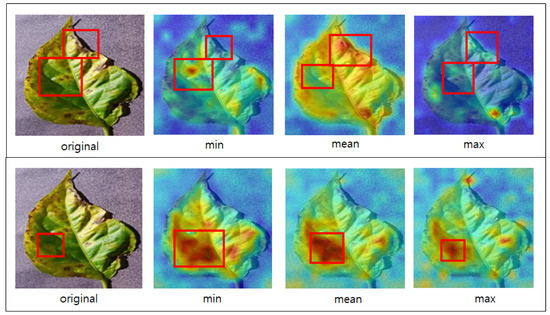 Figure 9 shows an image from which the attention map was extracted using the ViT model and Deit, specifically the multihead attention’s minimum (min), mean, and maximum (max) values. The above attention map corresponds to the ViT model, and the one below corresponds to the DeiT model. When the mean value is emphasized, each head focuses on a different position, allowing the model to recognize diseases at the edges of the image. However, the minimum and maximum values are concentrated in the localized areas of the image. The attention map of DeiT exhibits a pattern different from that of ViT. ViT’s attention map shows a wide distribution when emphasizing the mean value but that of DeiT shows variations in distribution based on the minimum, mean, and maximum values but still focuses on common areas. By visually examining the image, the model may seem to focus on normal leaf regions rather than diseased parts. However, upon closer examination of the attention maps for mean and maximum values, it becomes apparent that the model recognizes the diseases.