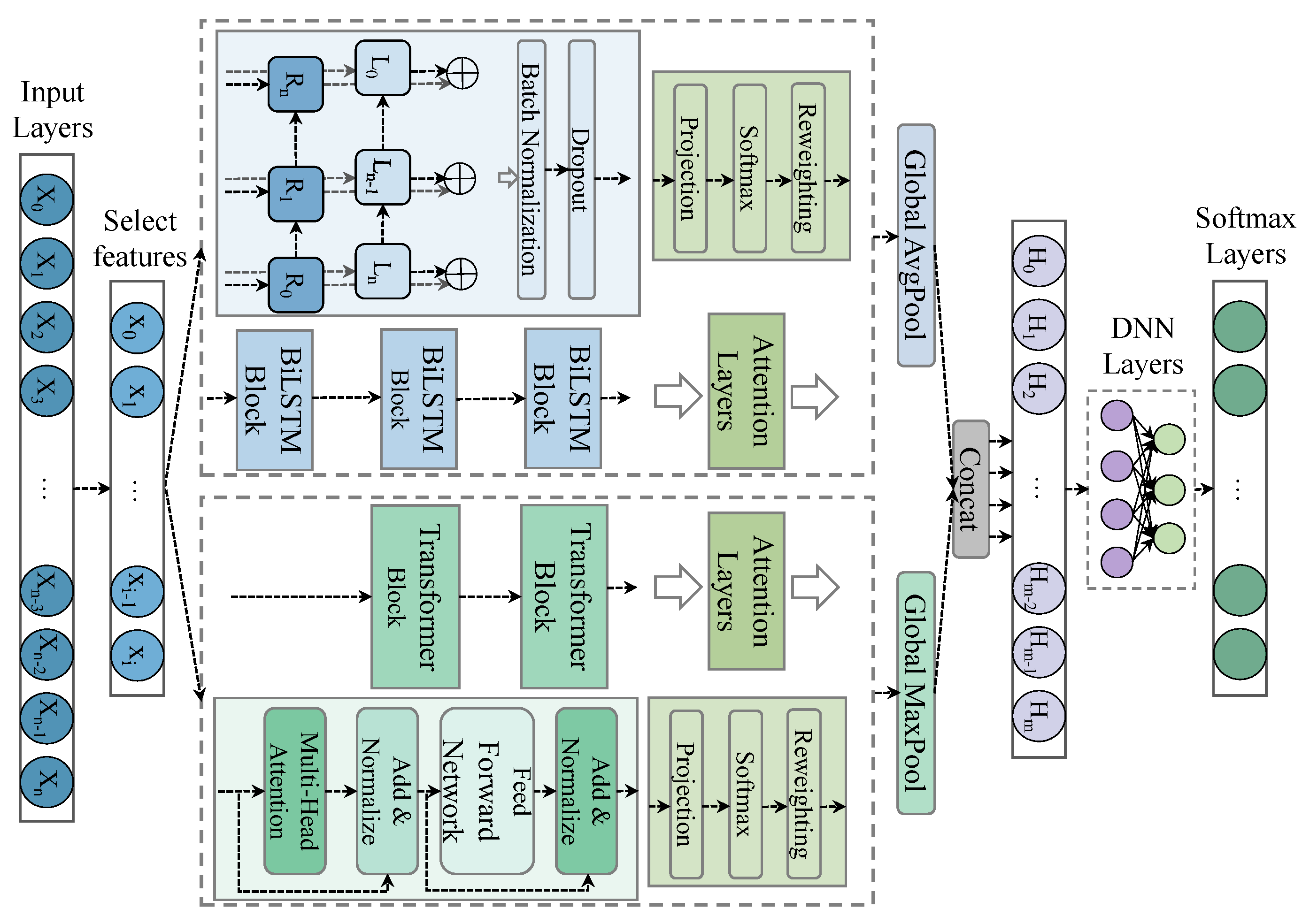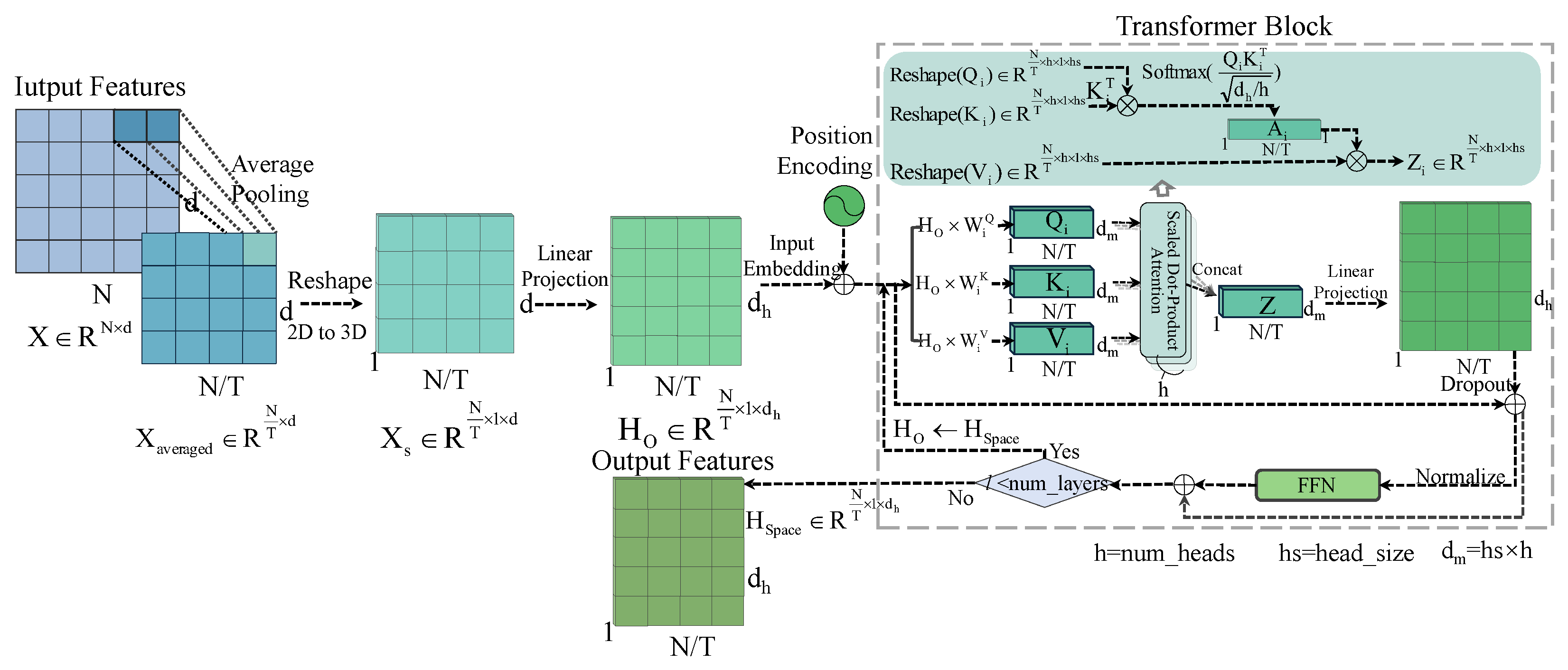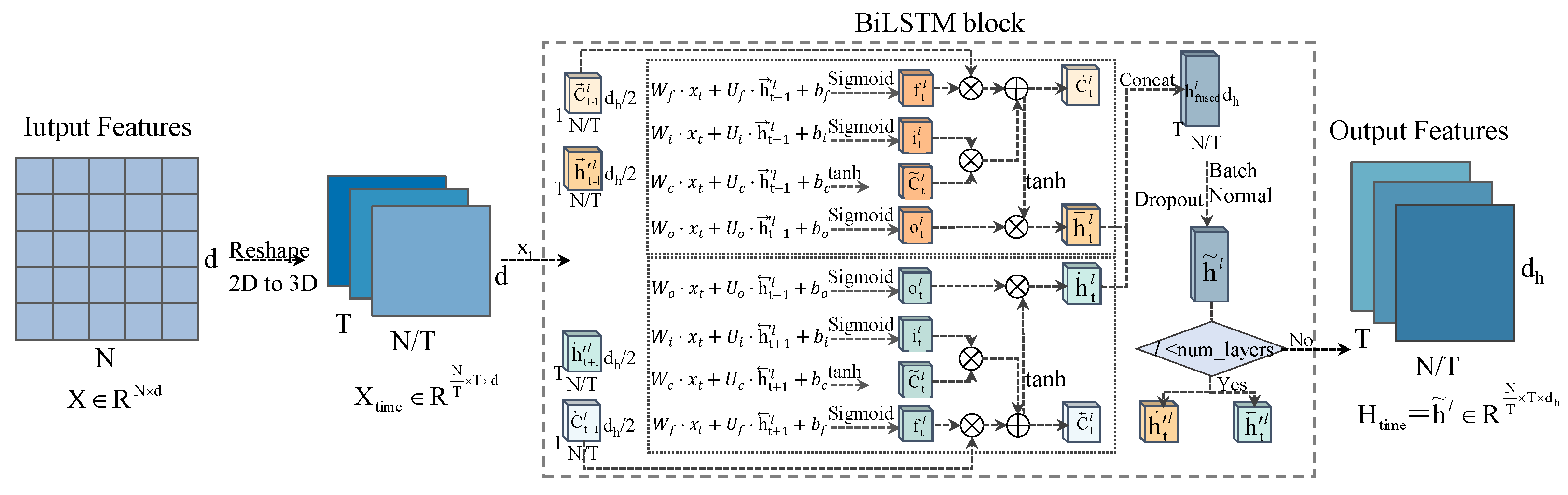 - A dual-branch spatiotemporal parallel feature extraction architecture is developed. The original features are restructured using a time window of , and a three-layer stacked BiLSTM is employed to capture temporal dependencies bidirectionally. A sliding average strategy is used for sample alignment, and a lightweight Transformer is applied to model global spatial relationships. Each branch outputs a 64-dimensional feature vector, enabling efficient parallel modeling of spatiotemporal features in the IoV.