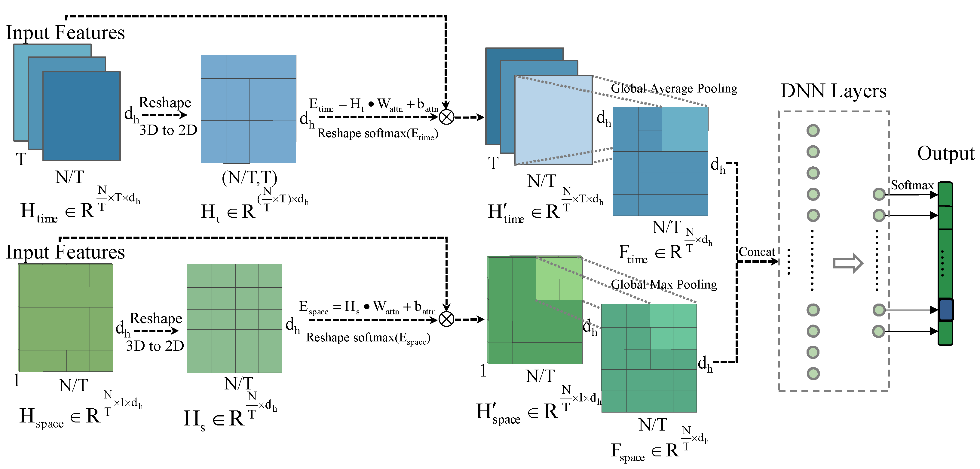 - An adaptive feature dimension weighting mechanism is designed. Each of the spatiotemporal dual branches employs a 64 × 64 feature fusion weight matrix to dynamically compute attention scores, enabling dynamic weighting at the dimensional level. A differentiated pooling strategy is then applied to the adaptively weighted output features, enhancing the representation of key features.