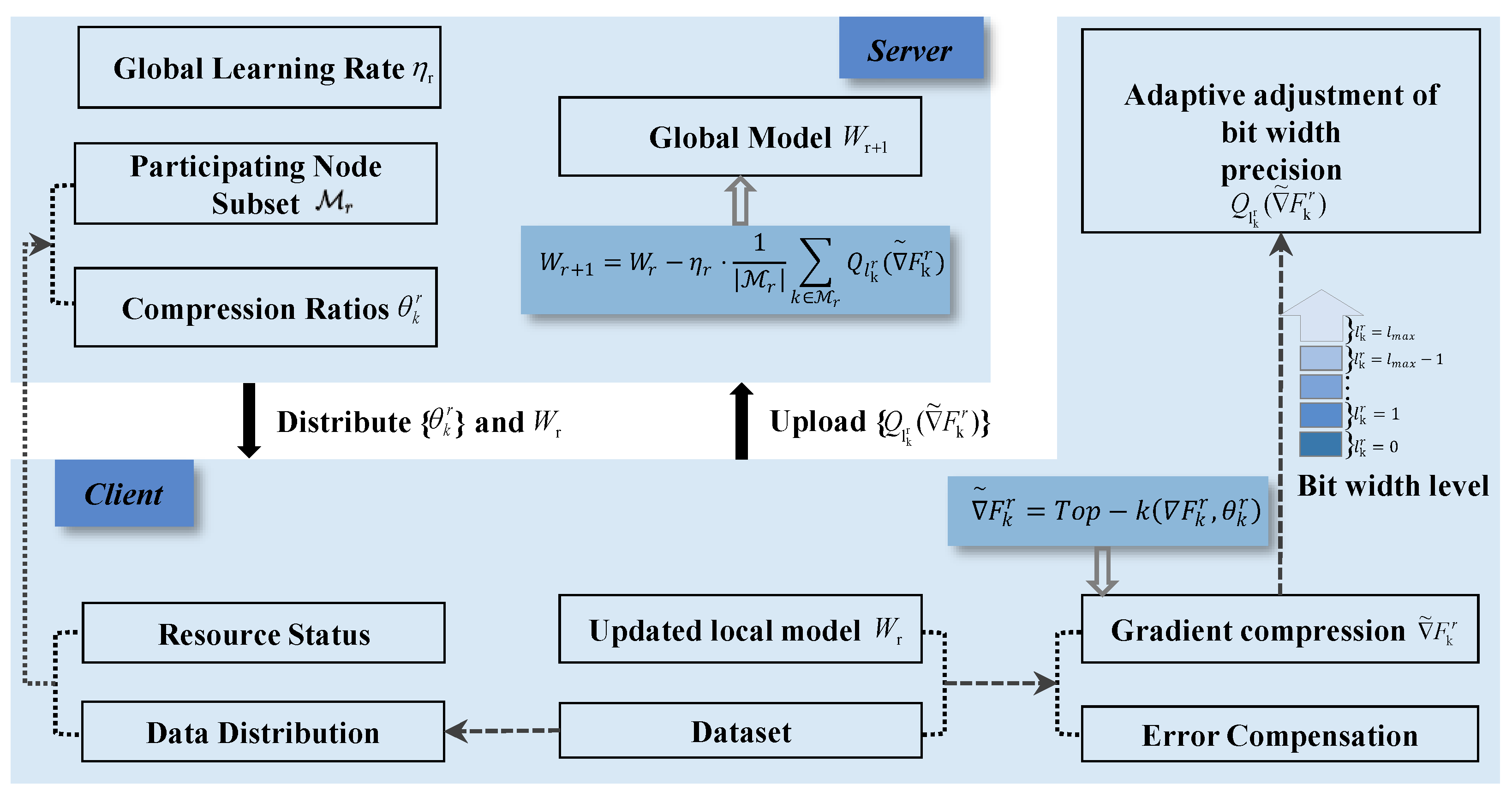 - Xu, Y.; Jiang, Z.; Xu, H.; Wang, Z.; Qian, C.; Qiao, C. Federated learning with client selection and gradient compression in heterogeneous edge systems. IEEE Trans. Mob. Comput. 2023, 23, 5446–5461. [Google Scholar] [CrossRef]