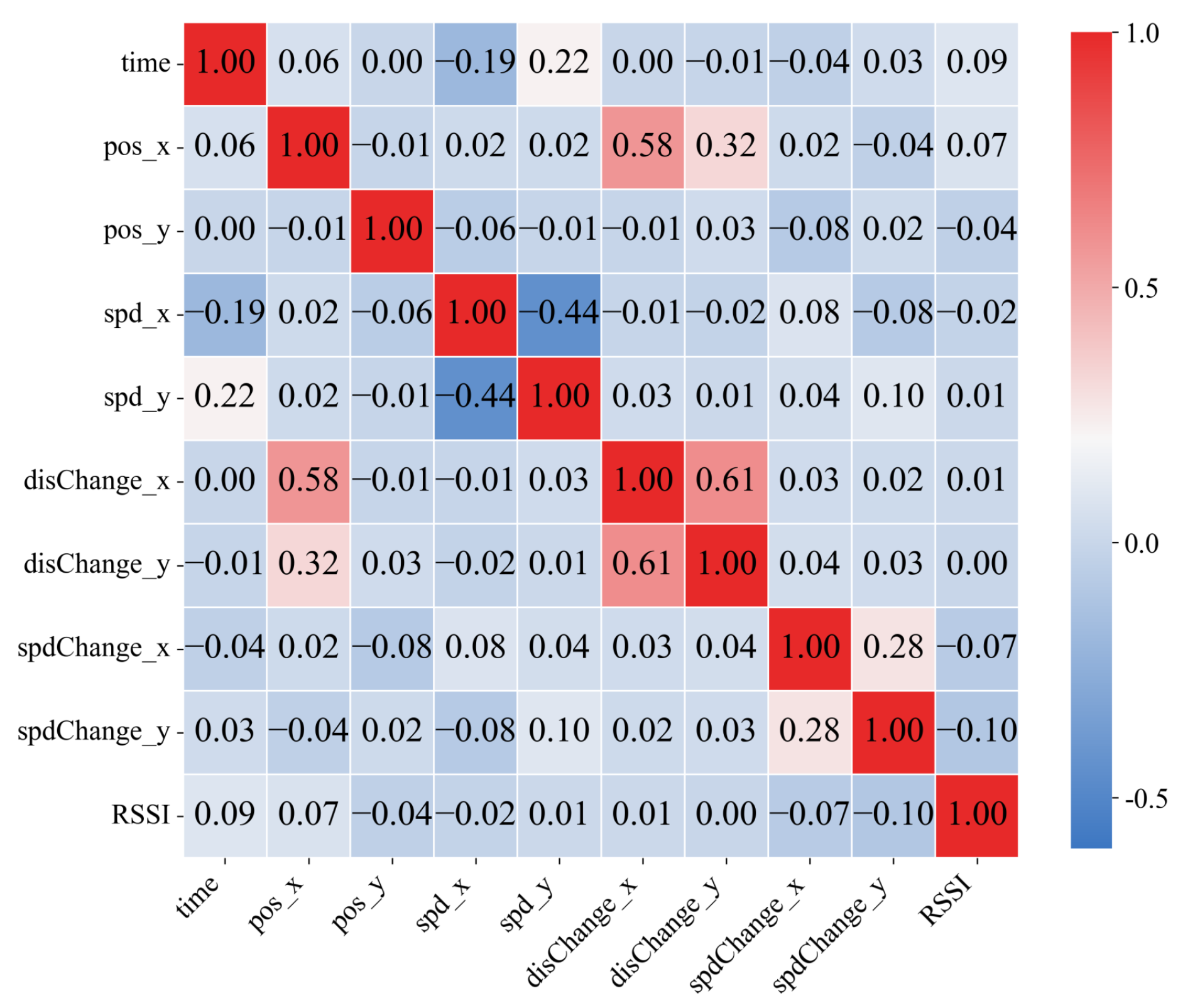 - Data Cleaning and Feature Selection: Missing values in the dataset are filled using mean imputation, duplicate records are removed, and outliers are corrected. In total, 32,557,534 records are retained, with the ratio of benign to attack records being approximately 8:2, and the proportions of the five attack types are approximately 9:9:10:7:8. Next, the Pearson correlation coefficient was used to analyze the linear relationships between key vehicle features extracted from the original log files. As shown in Figure 7, the absolute values of the correlation coefficients for all feature pairs are below 0.7, which is well below the commonly used threshold of 0.8 for feature redundancy elimination. Therefore, no highly correlated features needing removal were identified in this study. In the subsequent experiments, the retained key features demonstrated good discriminative ability and model performance.