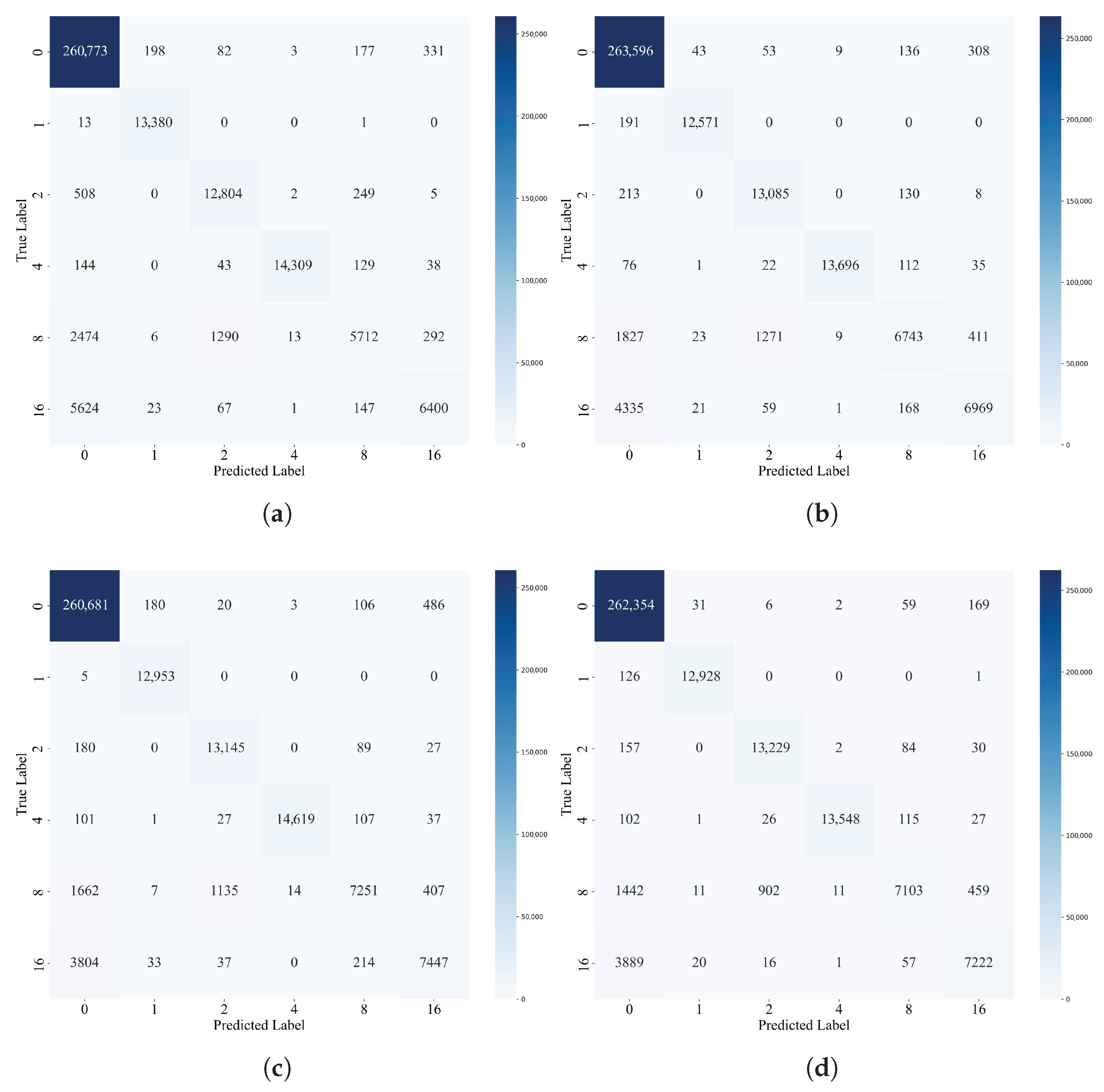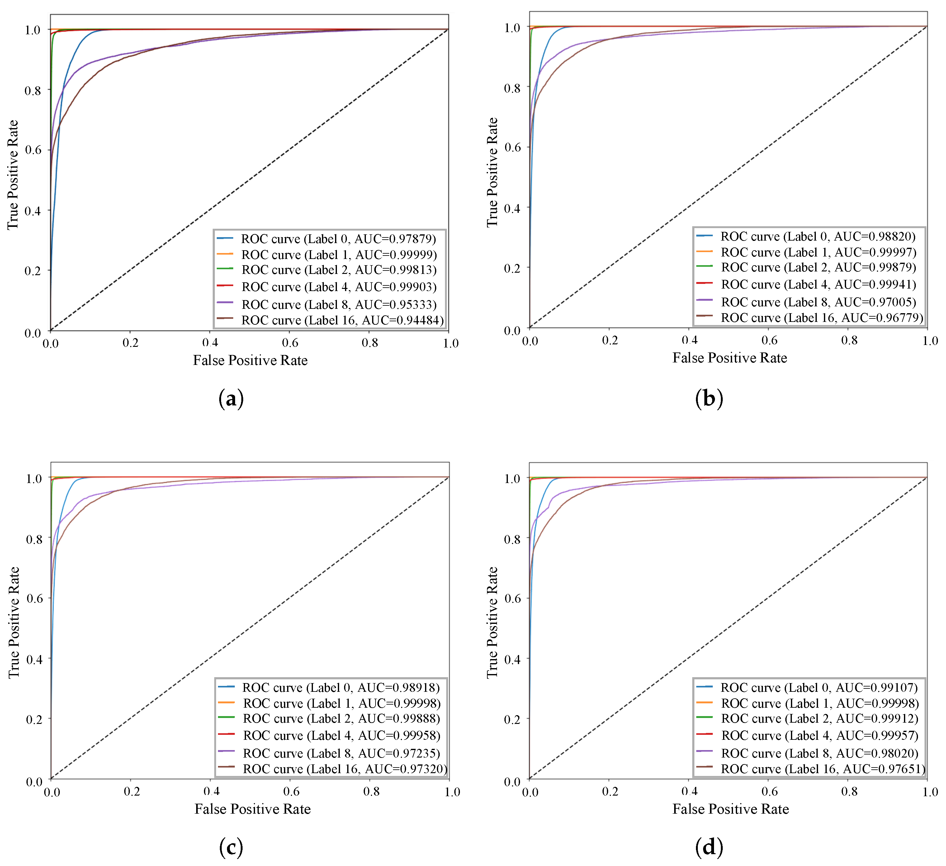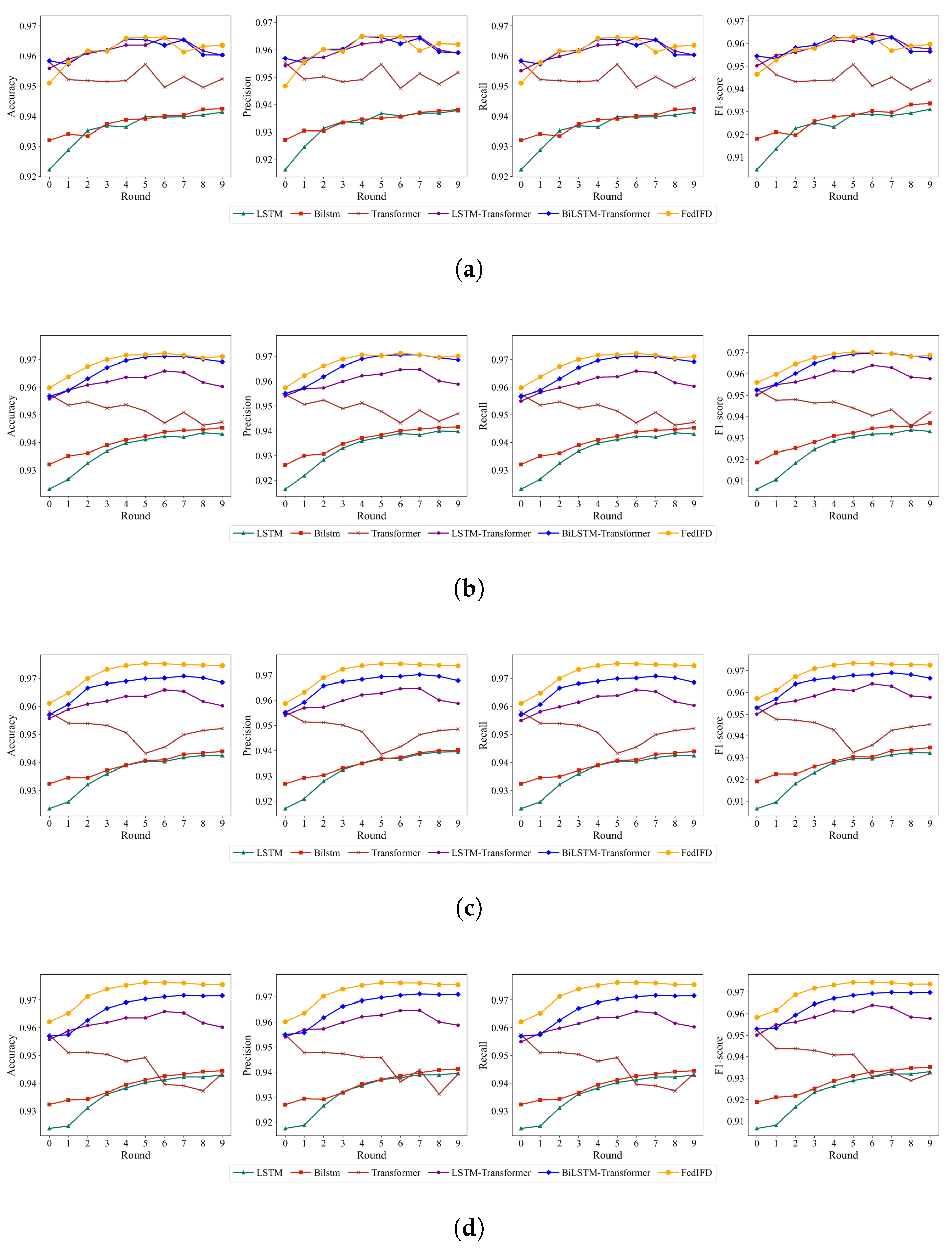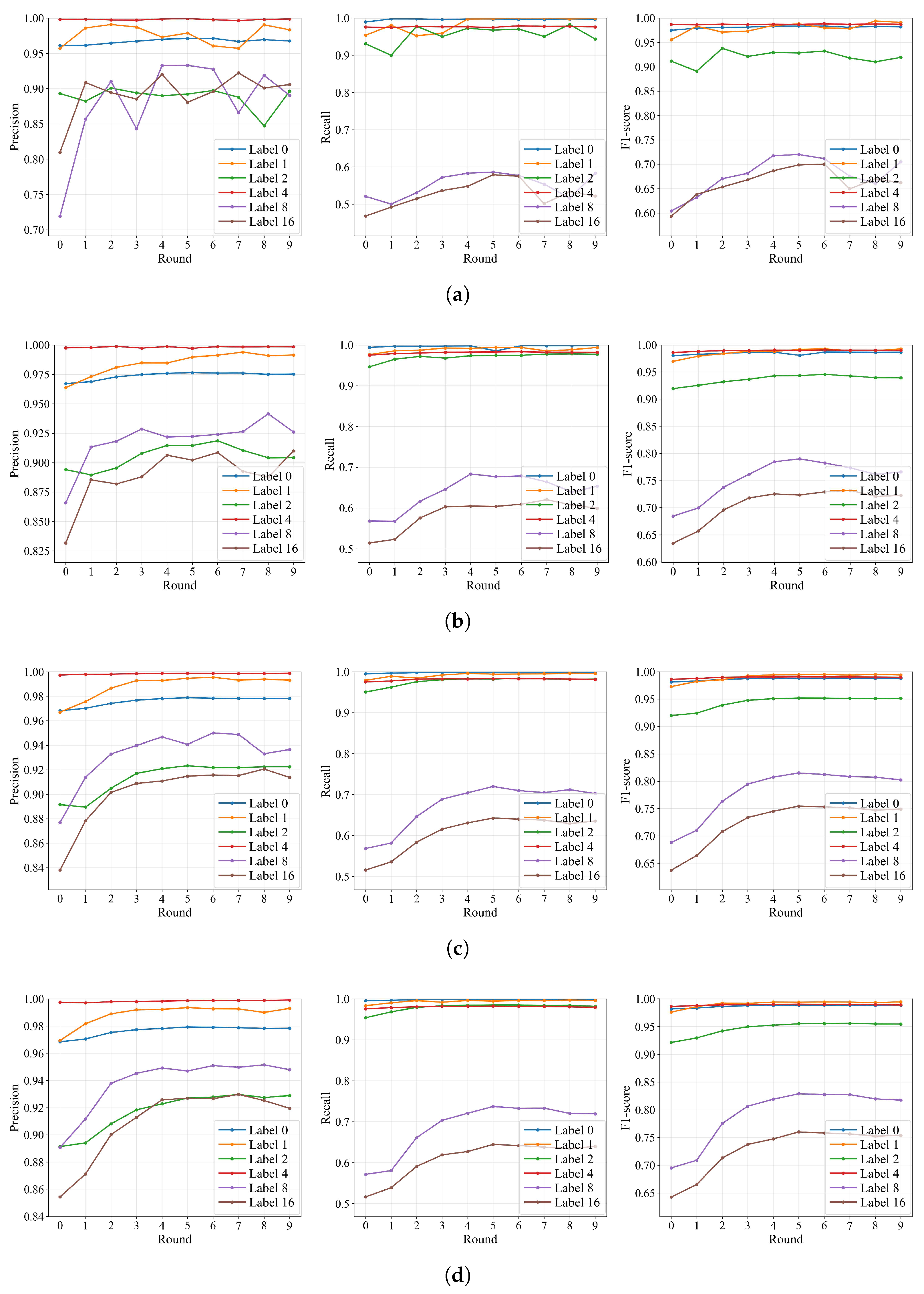 - Gap Between Experimental Assumptions and Real-World Conditions. First, regarding communication anomalies commonly found in the Internet of Vehicles—such as packet loss, delays, node disconnections, and data corruption—this study assumes that in typical scenarios involving such anomalies, vehicle nodes can ensure that local training results are eventually and effectively aggregated into the global model through methods like retries, data caching, or uploading at a later time. If a node remains offline for an extended period, its update is simply excluded from the current global aggregation process and does not affect the overall aggregation workflow. However, in real deployment, if there is a long-lasting high packet loss rate or severe latency—especially when attacks and network problems occur at the same time, such as attacks combined with poor communication to avoid detection—the global model’s detection performance can drop a lot. This can affect the model’s ability to recognize complex attacks (such as Label 8 and Label 16). In addition, the experiments mainly use one VeReMi simulation dataset to study five common attack types. The study assumes that data across different clients are similar and of good quality. However, simulation data cannot fully capture the complex changes, noise, and variety found in real vehicular networks. In real-world scenarios, data and attack patterns may be highly unbalanced due to different locations and driving behaviors. Also, the experiments only test a limited number of attack types. The study has not included more complex or newer attacks like Sybil attacks and replay attacks. This means the model’s performance may not fully show how well it works against real threats. To address these limitations, future research will incorporate real or hybrid vehicular network data and expand experiments to cover more diverse, collaborative, and stealthy attack scenarios. This will help to systematically improve the practicality and robustness of our approach and better meet real-world application needs. We will also consider extending our work by using models such as CNN, GNN, and Graph Transformer as future baselines.