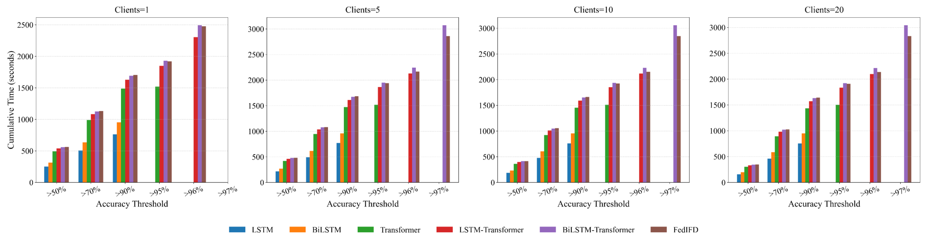 - Analysis of Computational Efficiency and Resource Consumption. The FedIFD approach improves detection performance while achieving a relative balance between accuracy and computational cost through careful design. It also enhances model training efficiency to some extent. However, this integrated multi-module structure inevitably increases the overall computational complexity. On vehicle terminals or RSUs with limited computing resources, the added computational load may lead to inference delays and deployment limitations. Therefore, the trade-off between model efficiency and accuracy must consider the resource constraints of real deployment environments. Further validation on edge devices is still needed to evaluate the efficiency in practical scenarios.