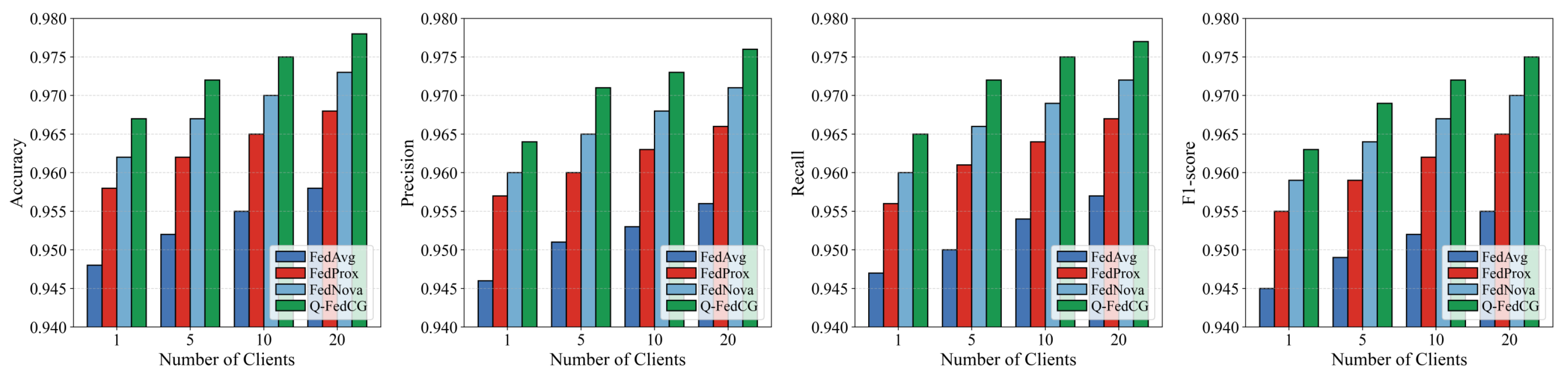 - Privacy and Robustness Considerations. Although federated learning preserves the privacy of raw data, risks such as gradient inversion and membership inference attacks may still occur during collaborative training across clients. These attacks can be used to infer sensitive distribution features or whether an individual sample participated in training. In addition, when there are malicious or compromised clients, Byzantine attacks and poisoning attacks may arise. These can contaminate the global model, resulting in significant performance degradation, manipulated predictions, or even privacy data leakage. To address these issues, future work will focus on two directions: first, exploring differential privacy to protect uploaded gradients by adding carefully tuned noise that mitigates gradient inversion and membership inference attacks while keeping training stable, thereby preventing the leakage of sensitive information from individual clients; second, investigating a reputation-based mechanism to identify and exclude malicious nodes by tracking client behavior, update quality, and consistency to compute trust scores, flagging and isolating nodes with abnormally low or declining scores, and excluding their updates during aggregation to enhance robustness against Byzantine and poisoning attacks.