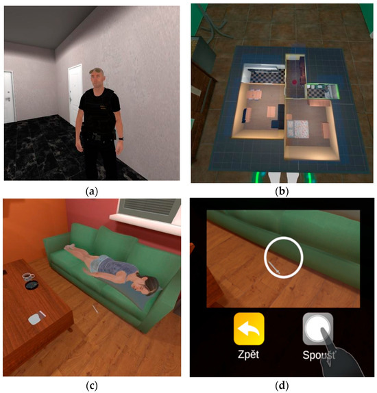 (a) VR avatar of the police investigator entering the crime scene. (b) Interactive map used for teleportation between rooms. (c) Virtual victim found on a couch in the living room. (d) Collection of forensic evidence indicating a crime (e.g., visible syringe).